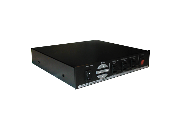 If you need to control the movements of 220VAC electromechanical Pan Tilt units you can use this controller with mini Joystick. It is equipped with 6 220VAC connectors (Common | Up | Down | Dx | Left | Pan) for the connection of the Pan-Tilt head. With this console you can also control a motorized 3 motors lens. To control zoom lenses this controller includes 6 12VDC connectors (Zoom +/- | Focus +/- | Iris +/-). On the front panel a mini joystick for pan-tilt control and 3 toggle switches for lens control are available. 12VDC power adapter is included.