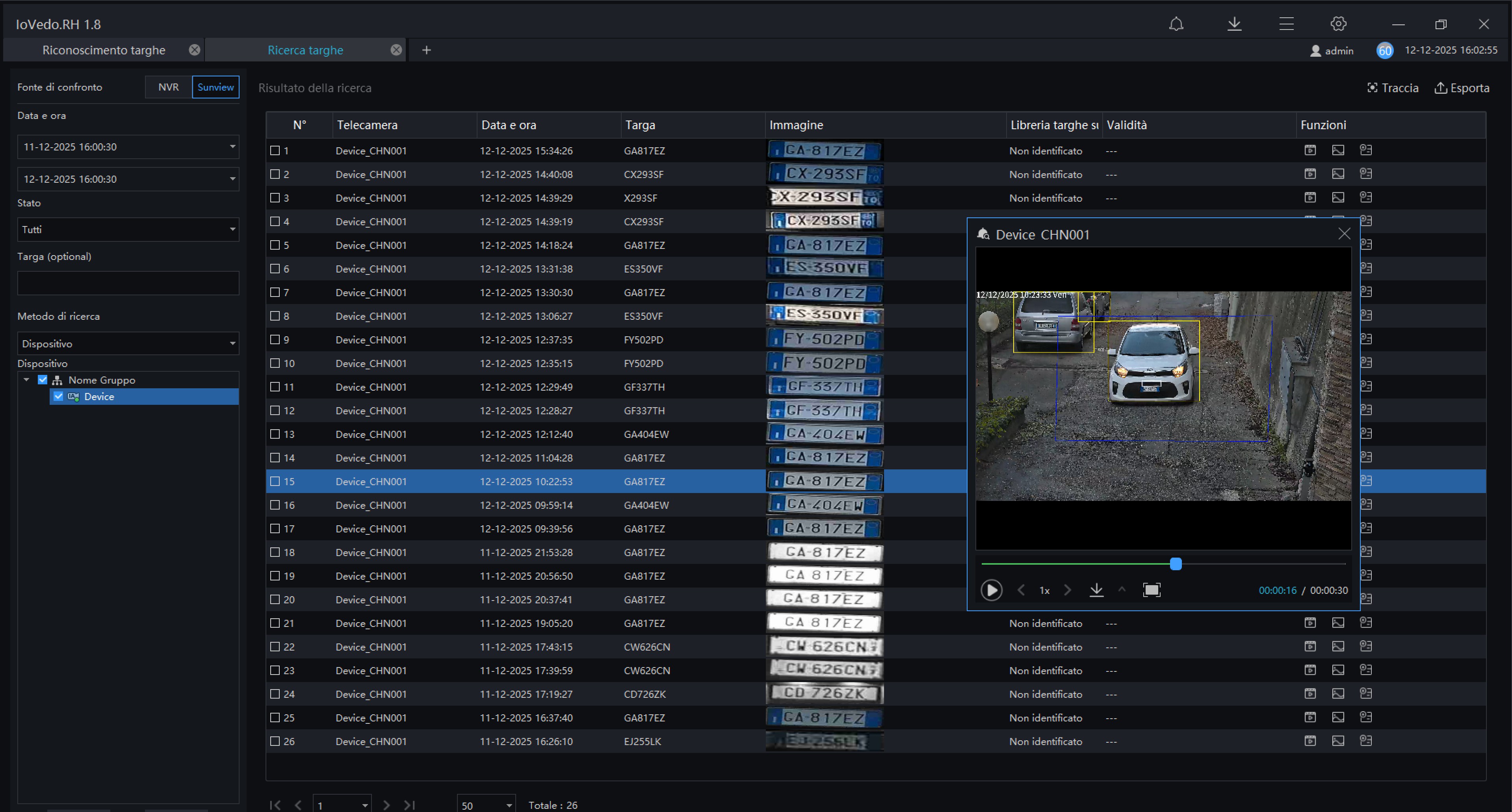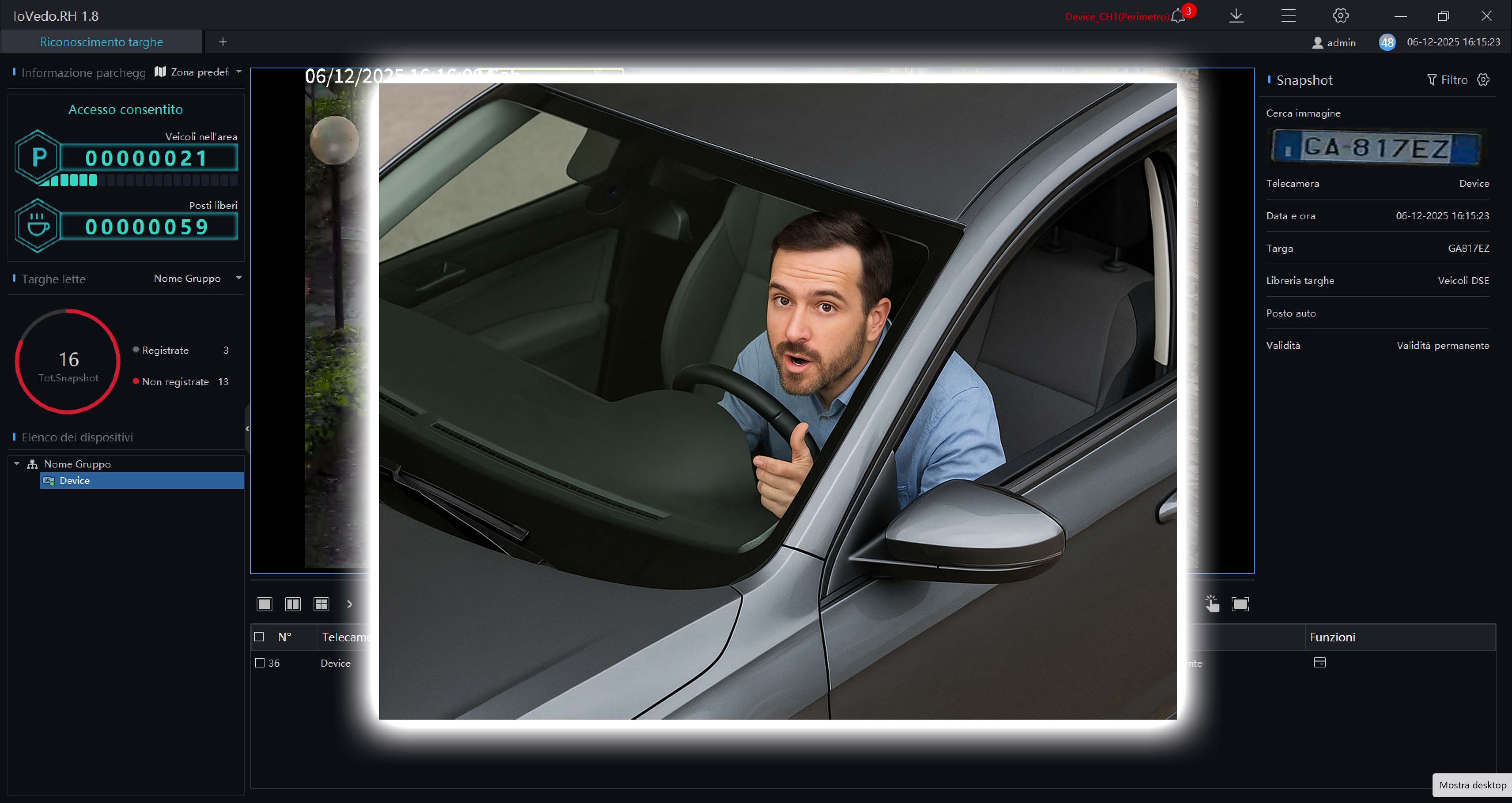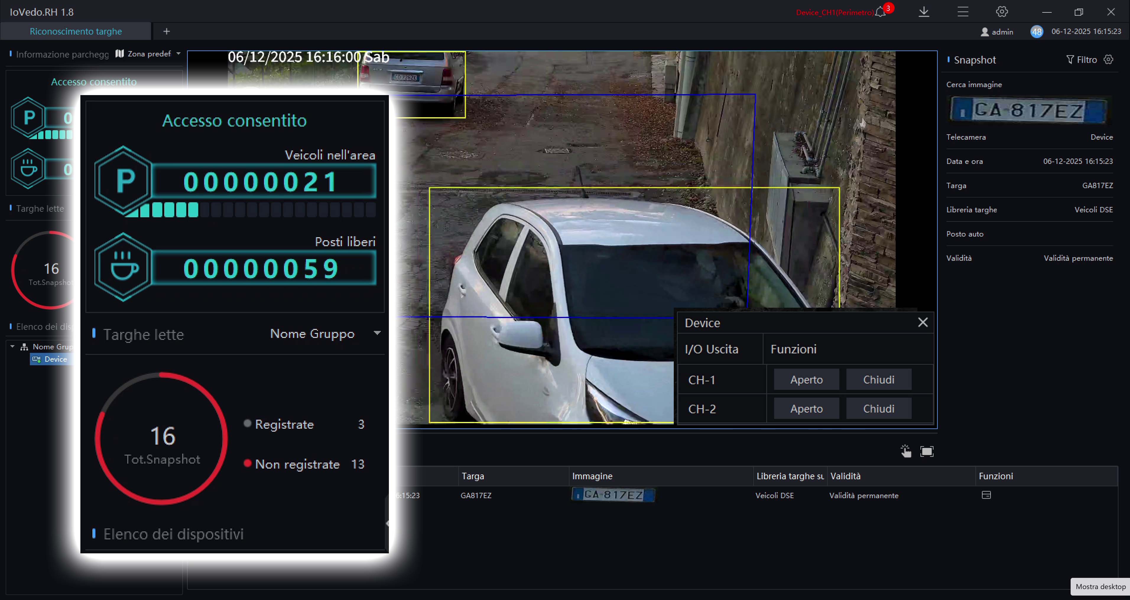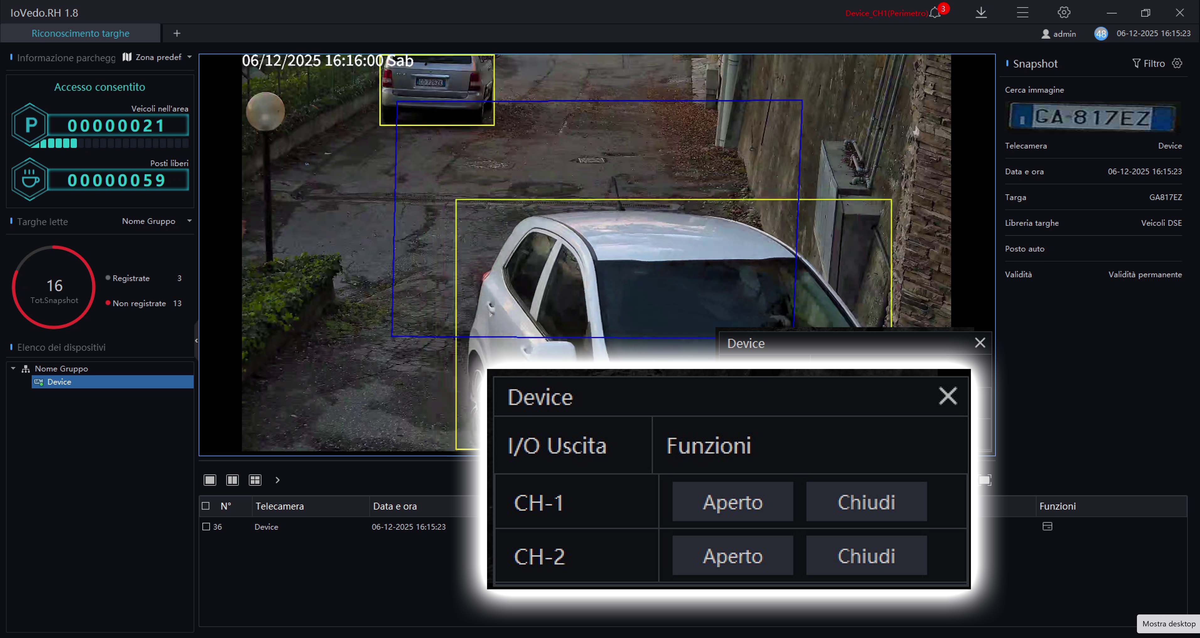 To manage our ANPR cameras from a computer, you can also use the IoVedo.RH software for Windows, available as a free download in the download area. This software is a powerful control station, ideal for security personnel. Unlike the browser—which can control only cameras connected to the local network—IoVedo.RH can also control cameras connected via P2P over the Internet, making it perfect for monitoring multiple remote sites. With IoVedo.RH you can MONITOR LICENSE PLATES in real time through a supervision window, SEARCH LICENSE PLATES with photos and video of each transit, and MANAGE AUTHORIZED PLATES.