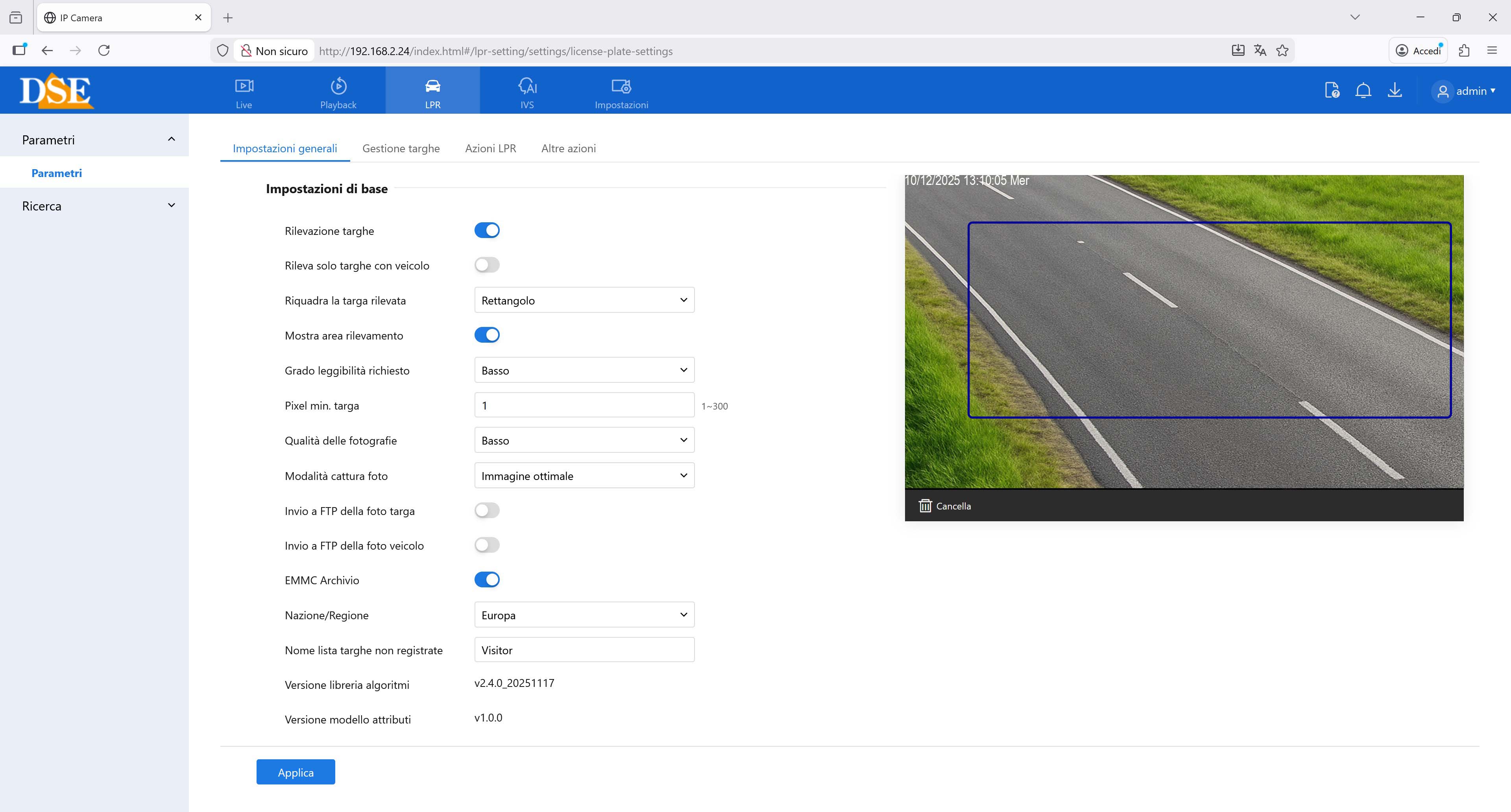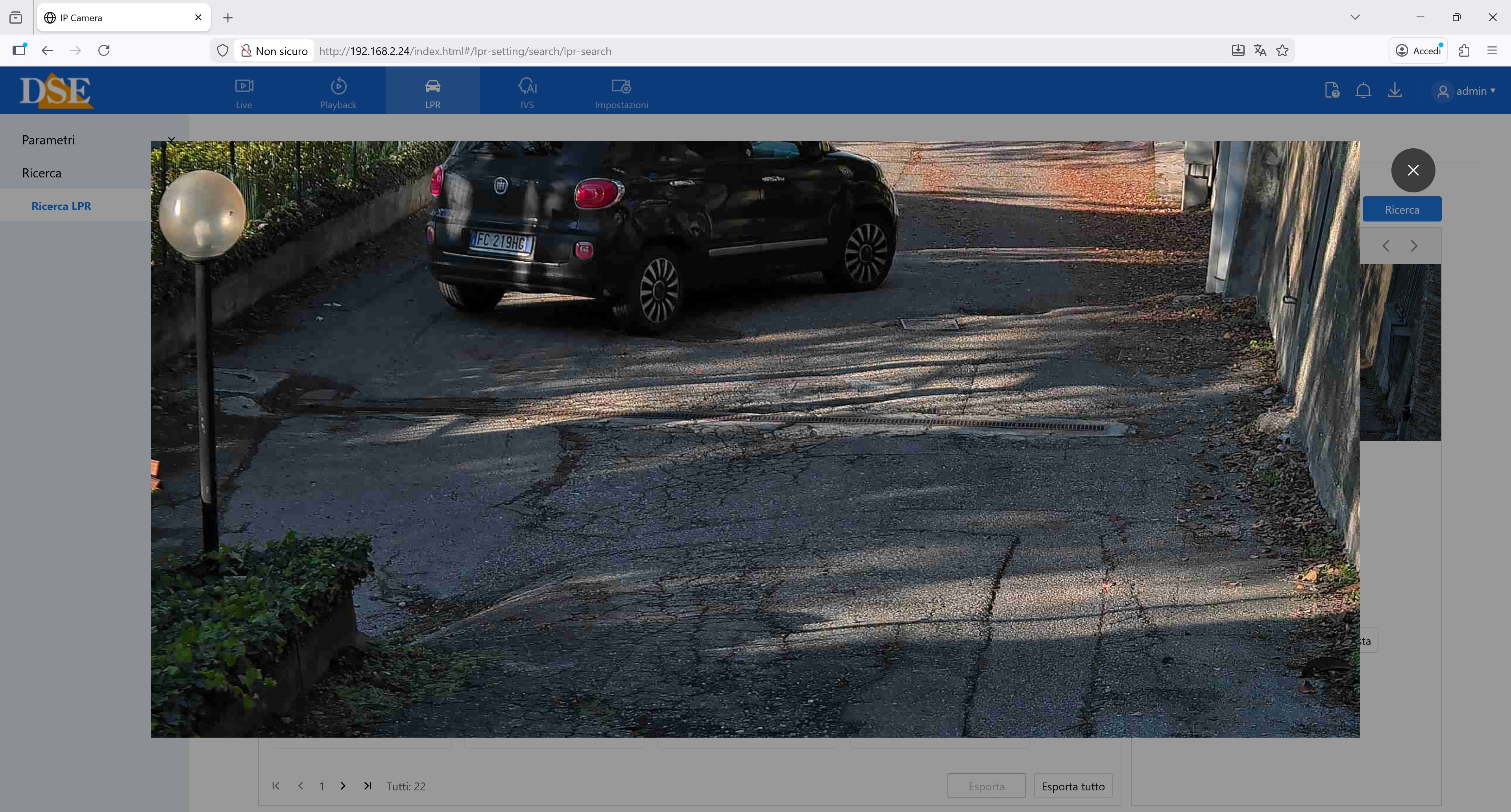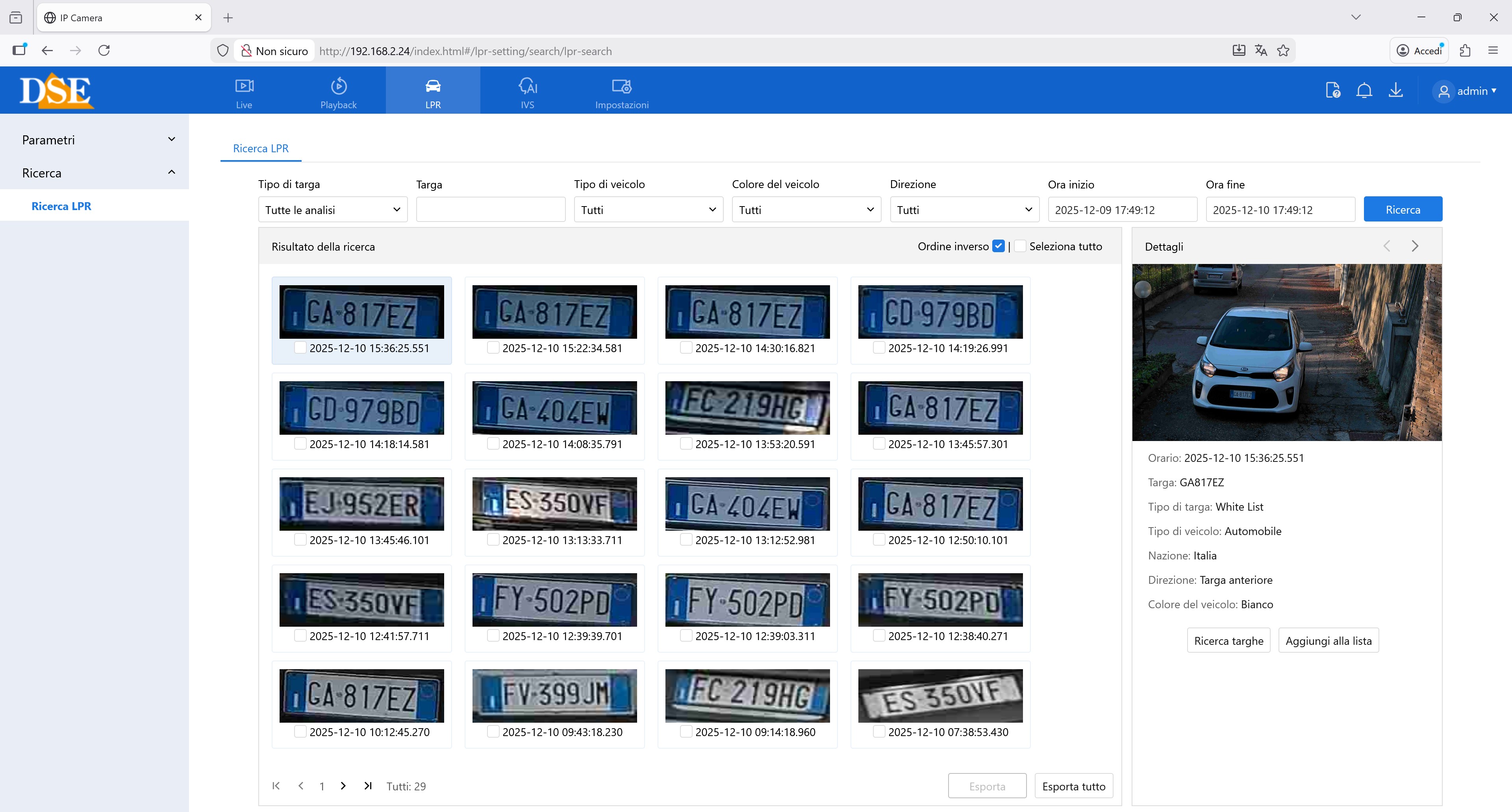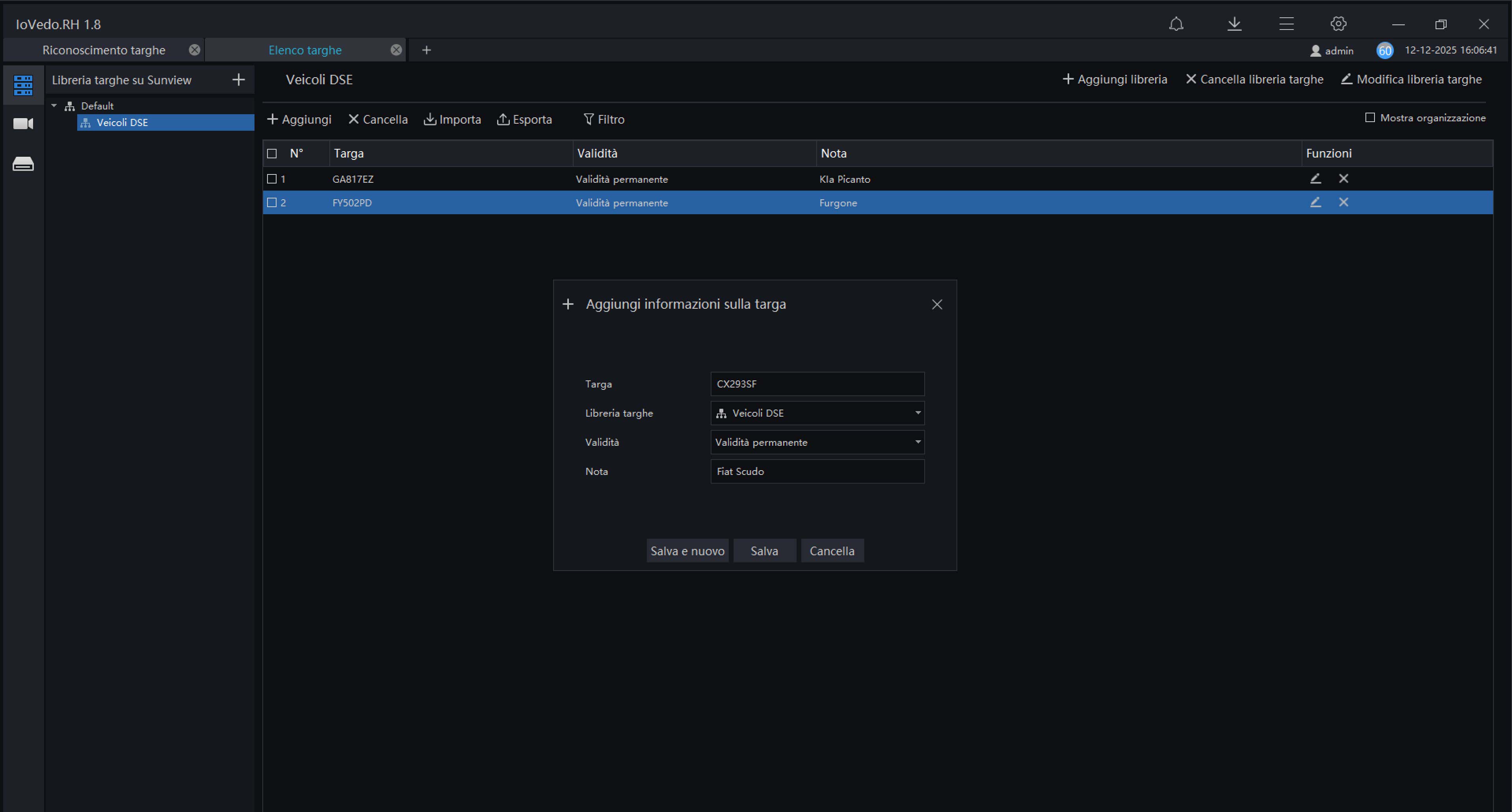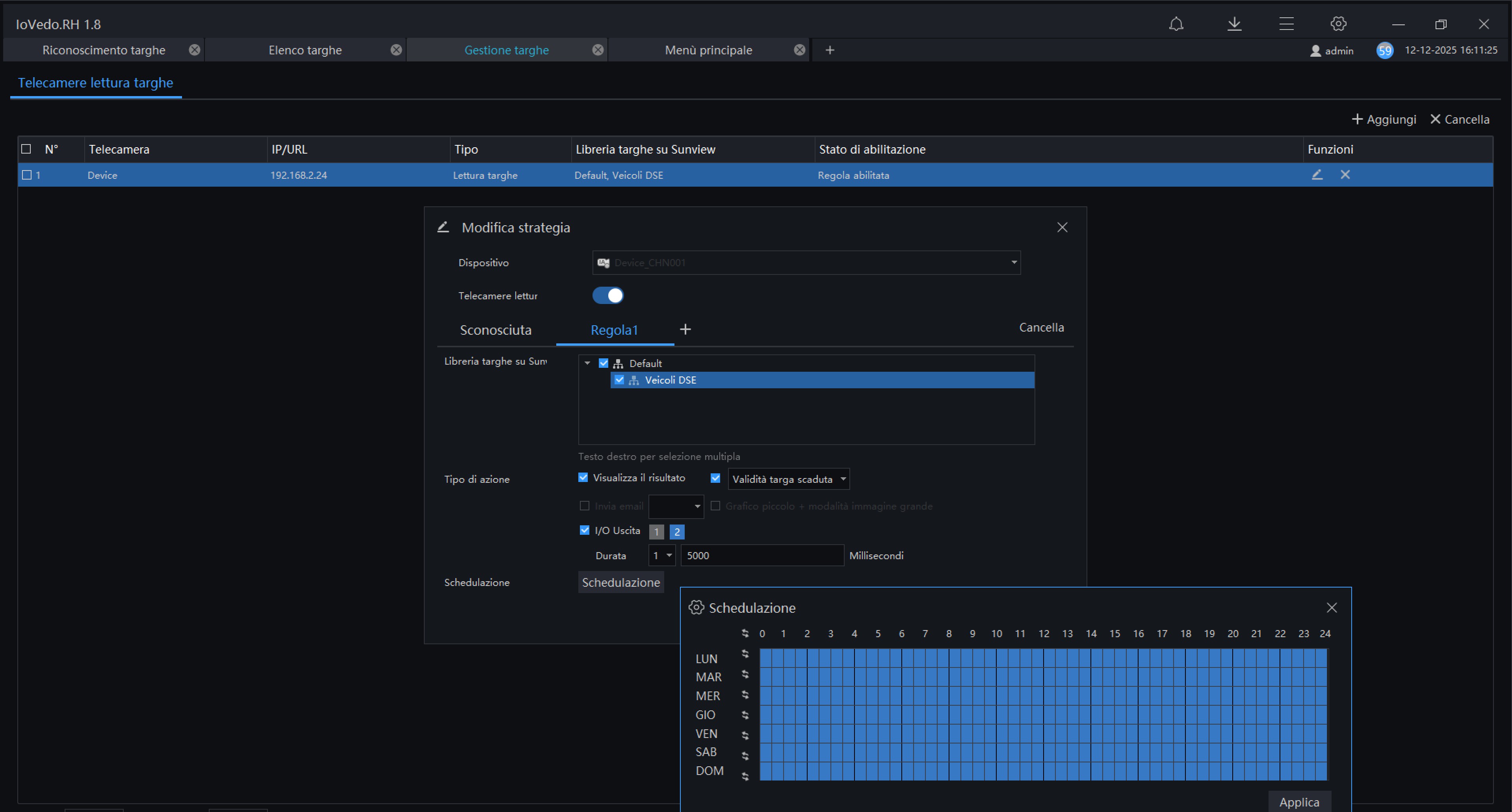 To manage our ANPR cameras from a computer, you can also use the IoVedo.RH software for Windows, available as a free download in the download area. This software is a powerful control station, ideal for security personnel. Unlike the browser—which can control only cameras connected to the local network—IoVedo.RH can also control cameras connected via P2P over the Internet, making it perfect for monitoring multiple remote sites. With IoVedo.RH you can MONITOR LICENSE PLATES in real time through a supervision window, SEARCH LICENSE PLATES with photos and video of each transit, and MANAGE AUTHORIZED PLATES.