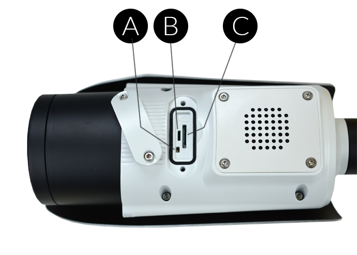 These cameras are equipped with a microSD card slot (C) supporting up to 1TB. Some model also include a 4GB internal memory. The internal memory is used to store authorized plate lists as well as photos and videos of detected plates. The removable memory, on the other hand, can be used to save general-view video recordings, either continuously or only when detections occur. You can access both memory areas from a PC or the app. The microSD slot is protected by a sealed cover, which also shields the reset button (A) and the LED indicator showing proper SD operation (B).