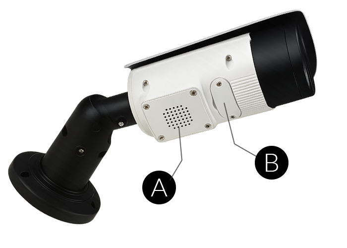 Unlike most ANPR cameras on the market, some of our LPR cameras feature a built-in microphone and a powerful speaker (A) that can be heard up to 20 meters away. You can use them to broadcast customized automatic voice messages or for two-way communication with drivers, an essential function for access control points. You can speak and listen easily from a computer or from the app.