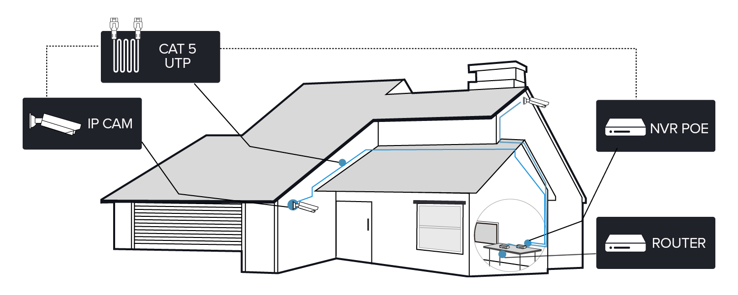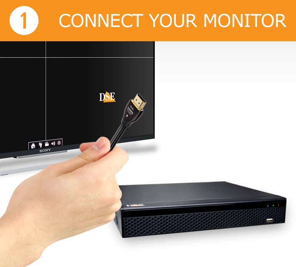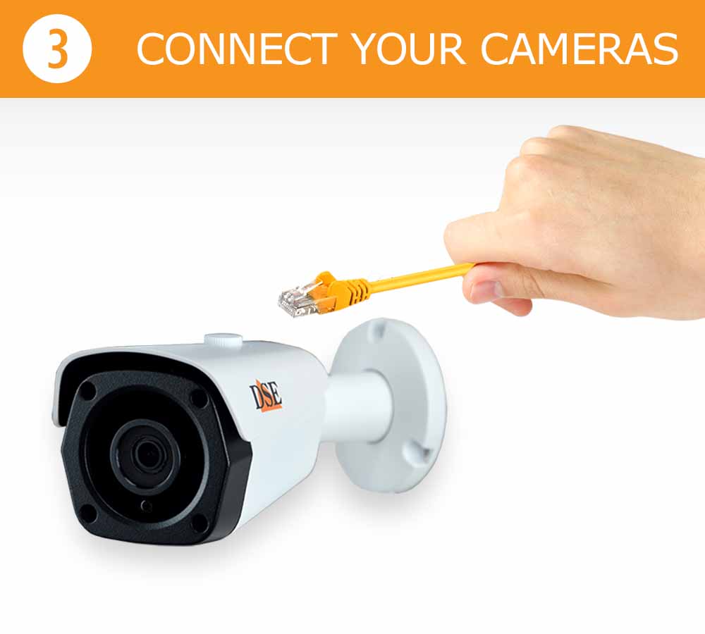 Our hard-wired CCTV kits are designed to be installed by anyone in minutes. They require no technical knowledge or computer skill and are ready to work as soon as installed, with no settings to adjust. You only need to connect the cameras to the NVR with a network cable. As a monitor you can use a TV set (HDMI) or a computer monitor (VGA). All instructions and menus are provided. See how easy it is, in 4 quick steps.