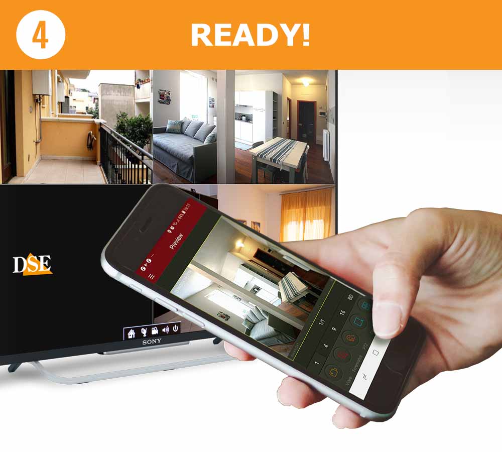With our free DSE APP for Android and iOS, you can control your cameras with a mobile phone or tablet. You can use the app over your own wifi network, by typing the IP address of the NVR, but also via the Internet, typing in your CLOUD ID. You can WATCH up to 16 cameras live on the screen. You can RECORD , take snapshots and ZOOM IN with the classic two-finger gesture. You can also PLAY BACK online videos recorded on the NVR's memory, searching by date and time. If you enable motion detection, you can RECEIVE push notifications on your mobile phone if an intrusion occurs, with a snapshot of the event.