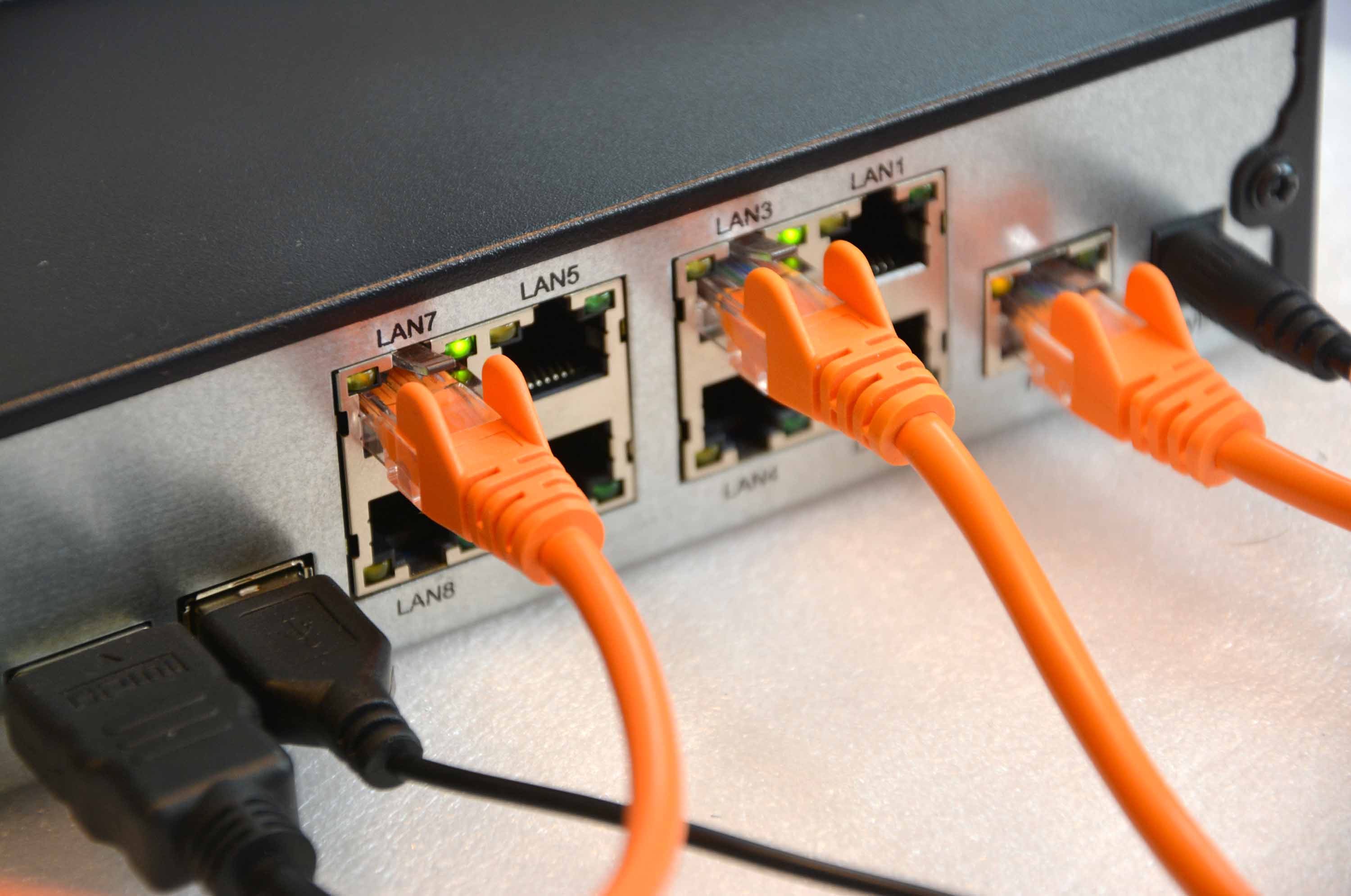 These POE video surveillance kits are made up of an NVR, the video recorder, and IP cameras. Each camera must be connected to the NVR with a network cable. You can use our Patch cords up to 20 m. or our cable coils for longer wiring or when you must pass through pipes. On the back of the NVR you will find the POE network ports to which you connect the cameras. These POE kits are ideal for protecting flats or shop where cameras and NVR can be hardwired. They provide higher performance than our WiFi wireless kits. Check out here the main connections available on the back of the NVR where you will connect all the elements of the system.