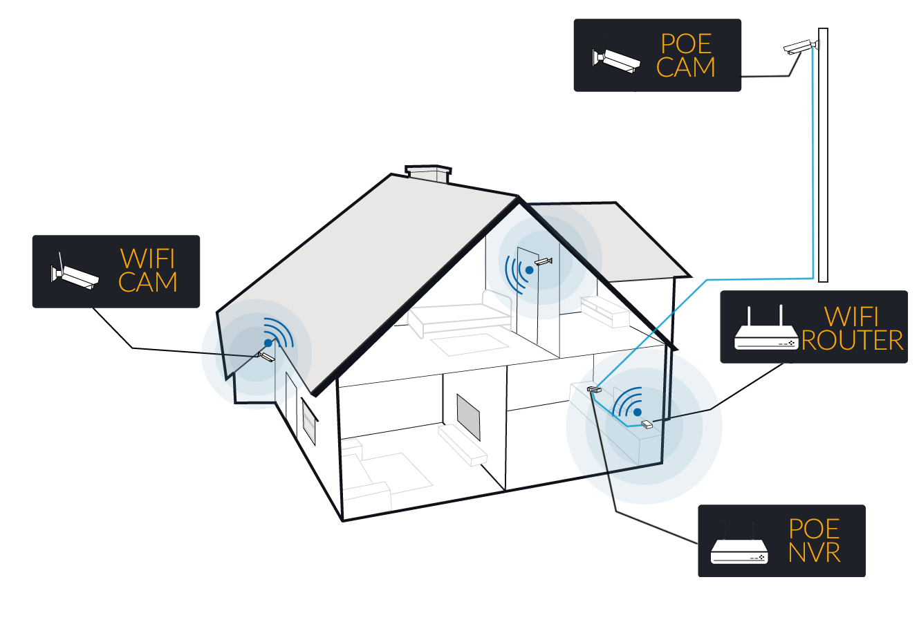 The cameras of these kits connect via cable to the POE ports of the NVR. If you have difficulty reaching the position you want via cable, you can connect the camera to your home network and add it to the kit as an external camera. You can do the same by purchasing separate wifi cameras to connect to your wireless home network. The NVRs in this range can handle up 9 or 16 cameras, between internal and external, with resolution up to 8MP (4K), also with audio and PTZ. Only our RKK kits offer a similar possibility of customization that allows you to design your very personal CCTV kit without limits. In this example, look at an NVR that manages a camera from the POE kit, connected by cable, and two wifi cameras connected to the local wifi network.