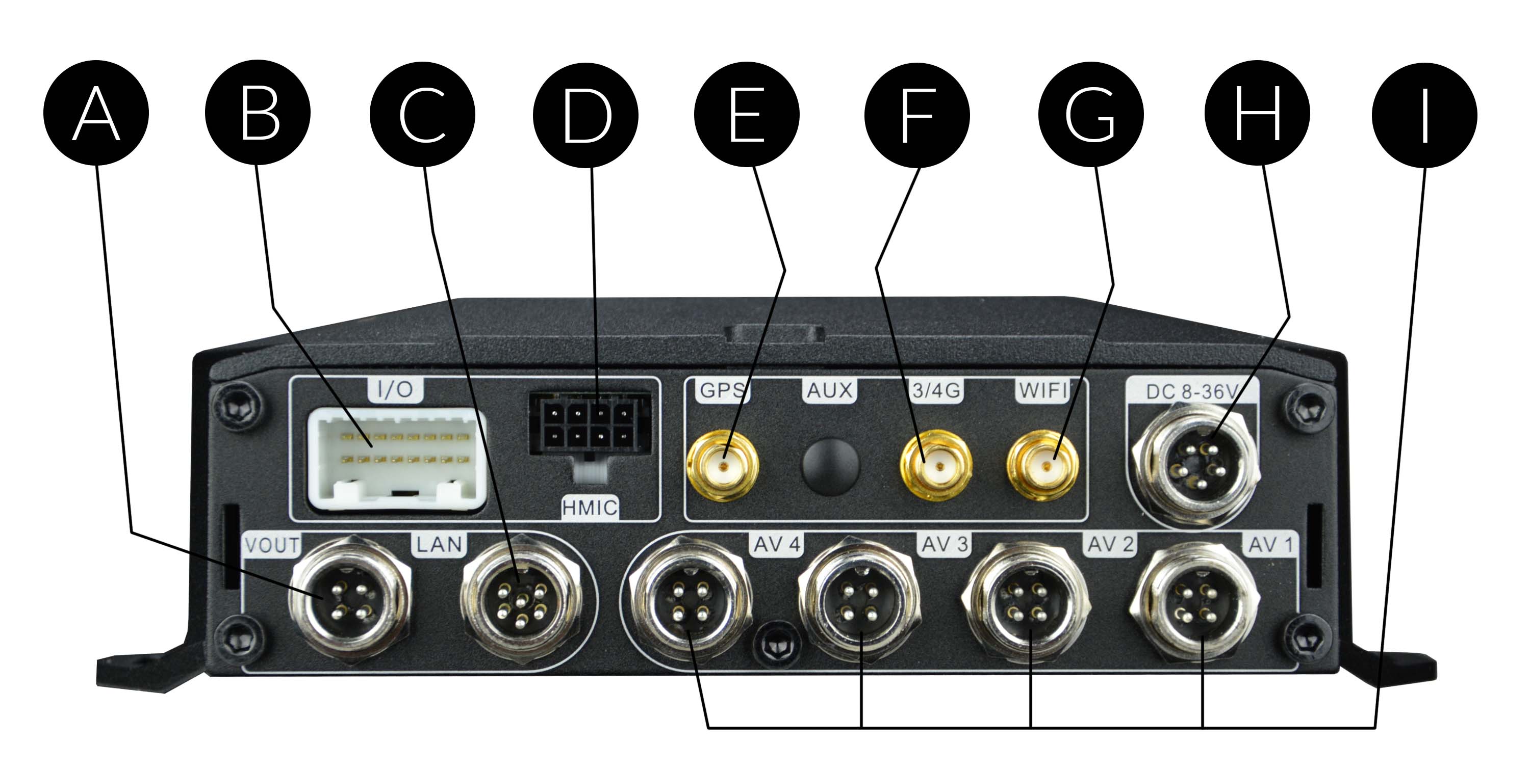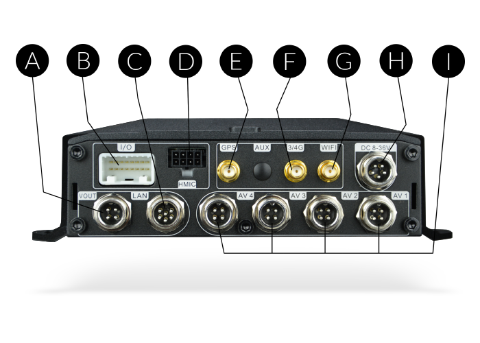 | H | DC | Here the power supply from the vehicle battery is connected. Our MDVRs accept 8 to 36VDC power supply to fit any vehicle's battery. |