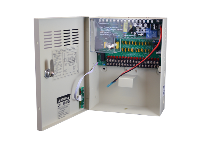 This is a centralized power supply box for 12V CCTV cameras which provides the option to install a backup battery against power failure. It connects to the 220V mains power and provides 18 12VDC outputs for cameras, each with PTC protection against overload. This power supply box can supply a maximum global current of 10A and takes advantage of switching technology. If you want to protect your CCTV system against power failure you can installed a 12V 7Ah rechargeable battery in this box. This power supply has the UPS function which provides uninterruptable switching from mains to battery power. For this reason you can use it to power digital devices, like DVR, as well as cameras.