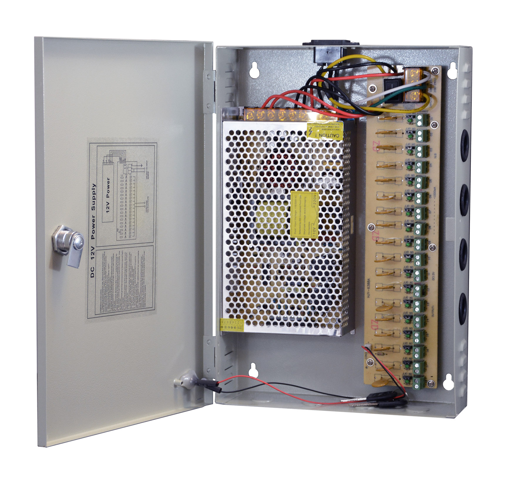 This is the classic centralized power supply for 12V CCTV cameras. It connects to the 220V mains and provides 18 12VDC outputs for cameras, each with PTC protection against overload. This power supply box can supply a maximum global current of 20A and takes advantage of switching technology. This PSU come in a strong metal box with on/off switch and key lock.