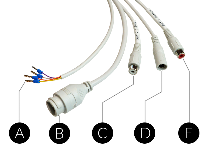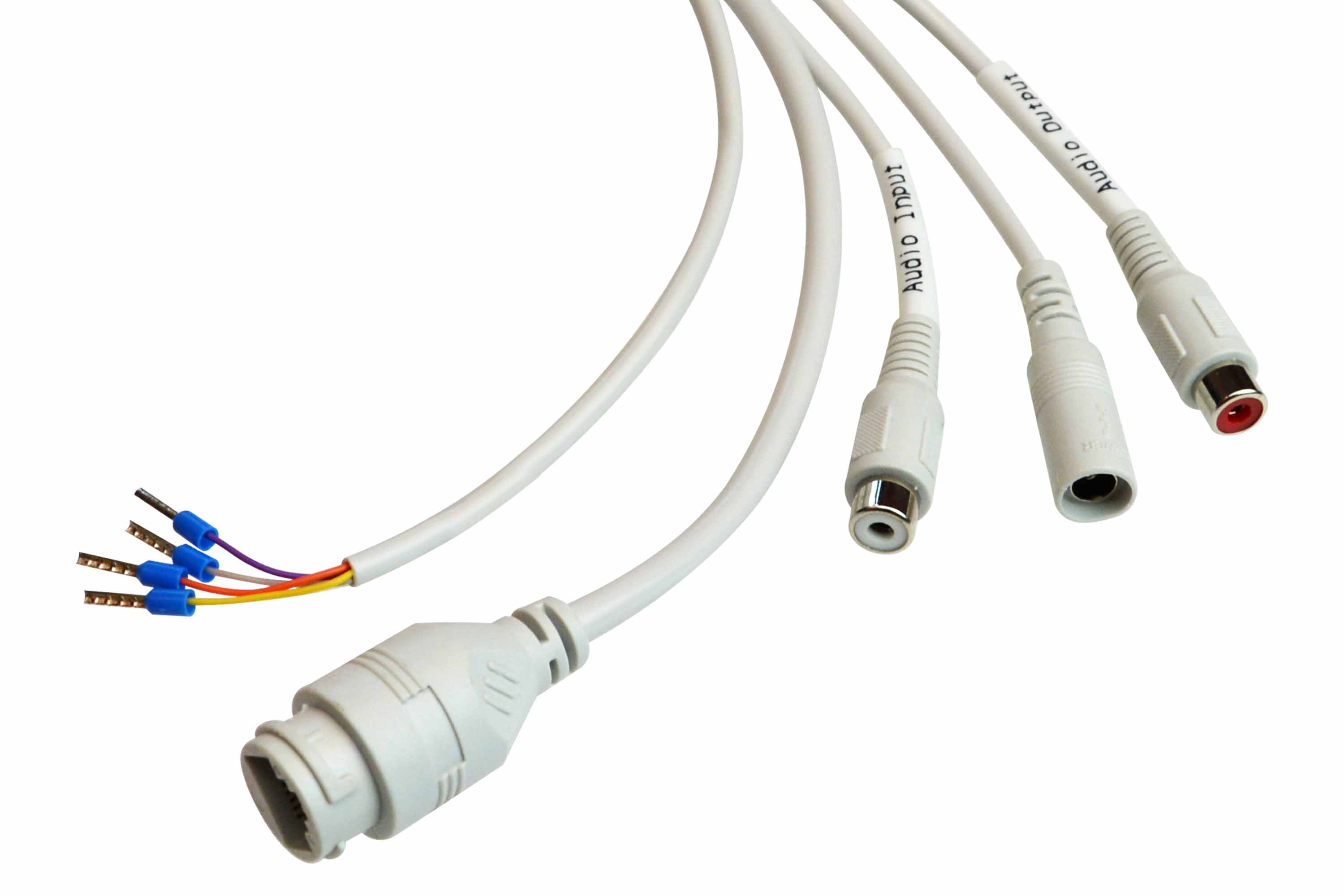 Many cameras in this range come with 1 or 2 alarm inputs for the connection of sensors, detectors, switches and other contacts that can generate automatic alarm actions. This makes these cameras perfect for automated industrial systems. These cameras also have an alarm output for the connection of devices to be activated in the event of an alarm, such as sirens or indicating lights. These alarm outputs are particularly useful in video analysis applications, to warn of unusual events. Here on the side is the connection cable of a full feature RH camera.