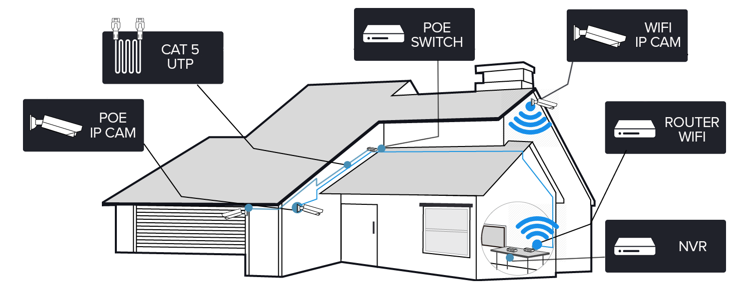 IP technology offers several advantages when compared to traditional analog CCTV (nowadays AHD). One of the most important benefit is the ability to connect wireless wifi cameras. With these WiFi cameras you can create a fully wireless CCTV system or an hybrid system, with a few hard-wired and a few wifi cameras. The video signal of our WiFi cameras is perfectly stable and reliable. Once your system is installed, you will not be able to notice any difference between the hard-wired cameras and the wireless ones. If you want to learn how to install a WiFi IP camera, check out the video tutorial on the left. Below you can see the diagram of a small, partly wired and partly wifi, IP CCTV system.