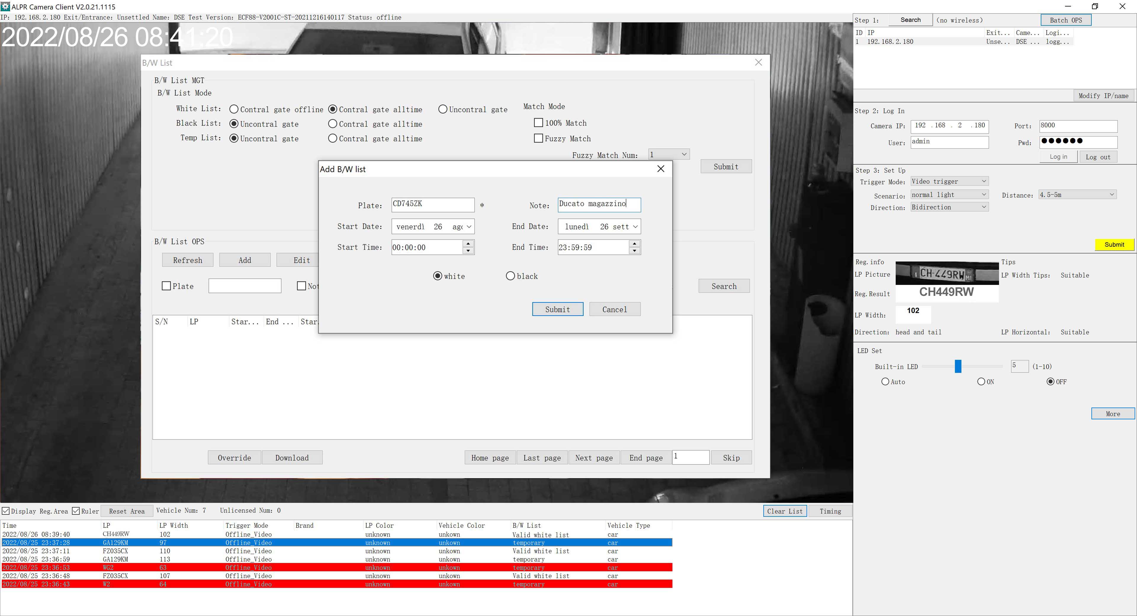 You can also upload a LIST OF CAR PLATES to the camera. The camera will activate the built-in relay output according to the vehicle license plate, managing BLACKLIST and WHITELIST. You can use this function to open a barrier or an automatic gate on the basis of the vehicle's license plate.