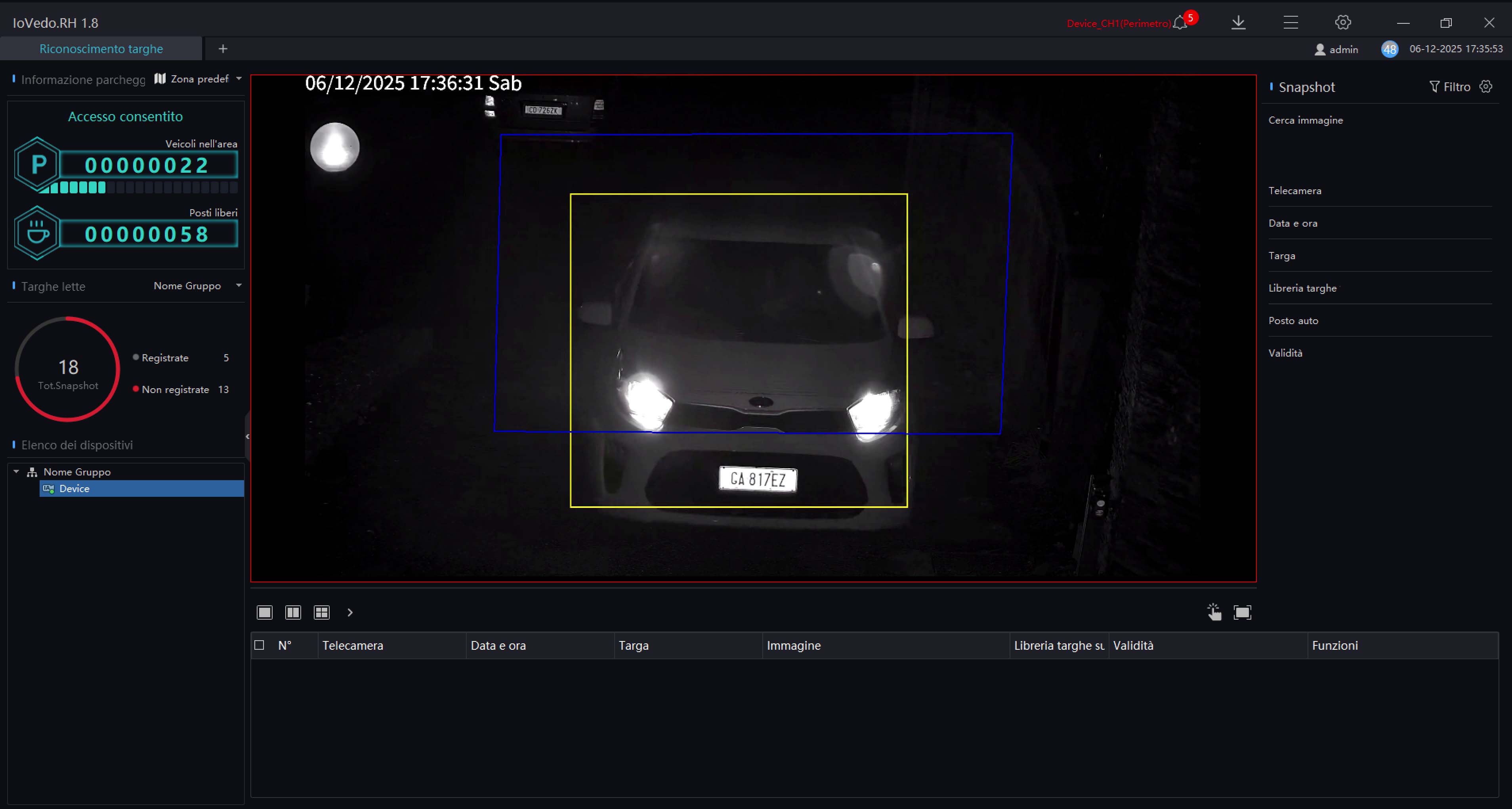 To manage our ANPR cameras from a computer, you can also use the IoVedo.RH software for Windows, available as a free download in the download area. This software is a powerful control station, ideal for security personnel. Unlike the browser—which can control only cameras connected to the local network—IoVedo.RH can also control cameras connected via P2P over the Internet, making it perfect for monitoring multiple remote sites. With IoVedo.RH you can MONITOR LICENSE PLATES in real time through a supervision window, SEARCH LICENSE PLATES with photos and video of each transit, and MANAGE AUTHORIZED PLATES.