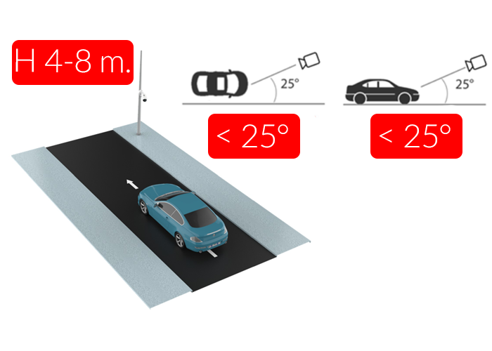 Although these cameras can read license plates in virtually any road-side scenario, the highest reading accuracy is achieved at the ideal distance of 5 to 30 meters. The cameras can be installed either above the roadway or on the roadside, maintaining an optimal height of 4 to 8 meters and an angle of less than 25° relative to the direction of vehicle travel. They can capture both front and rear plates, monitoring up to 3 lanes. Once the camera is installed, all adjustments can be performed remotely via computer.