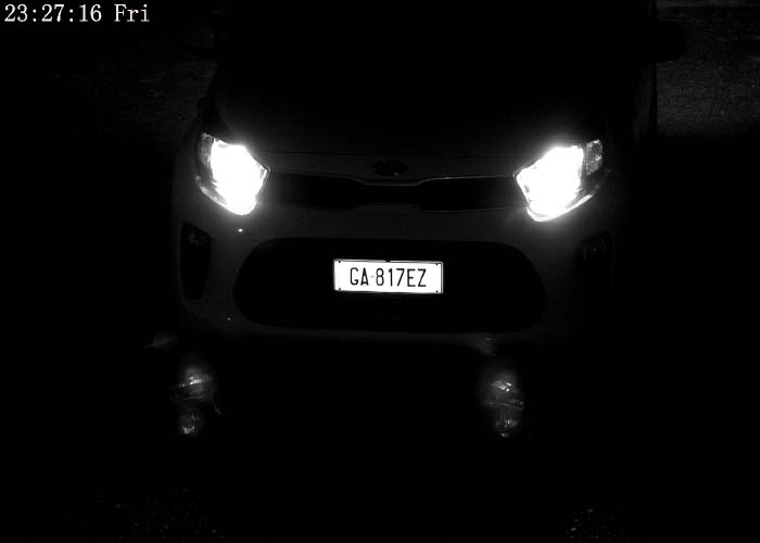 These ANPR cameras are equipped with an anti-glare system that allows them to capture license plates even at night, when standard cameras are blinded by vehicle headlights. In night mode, the cameras produce a very dark image that highlights the plate, illuminated in the darkness by the camera’s infrared illuminator, as shown in this example.