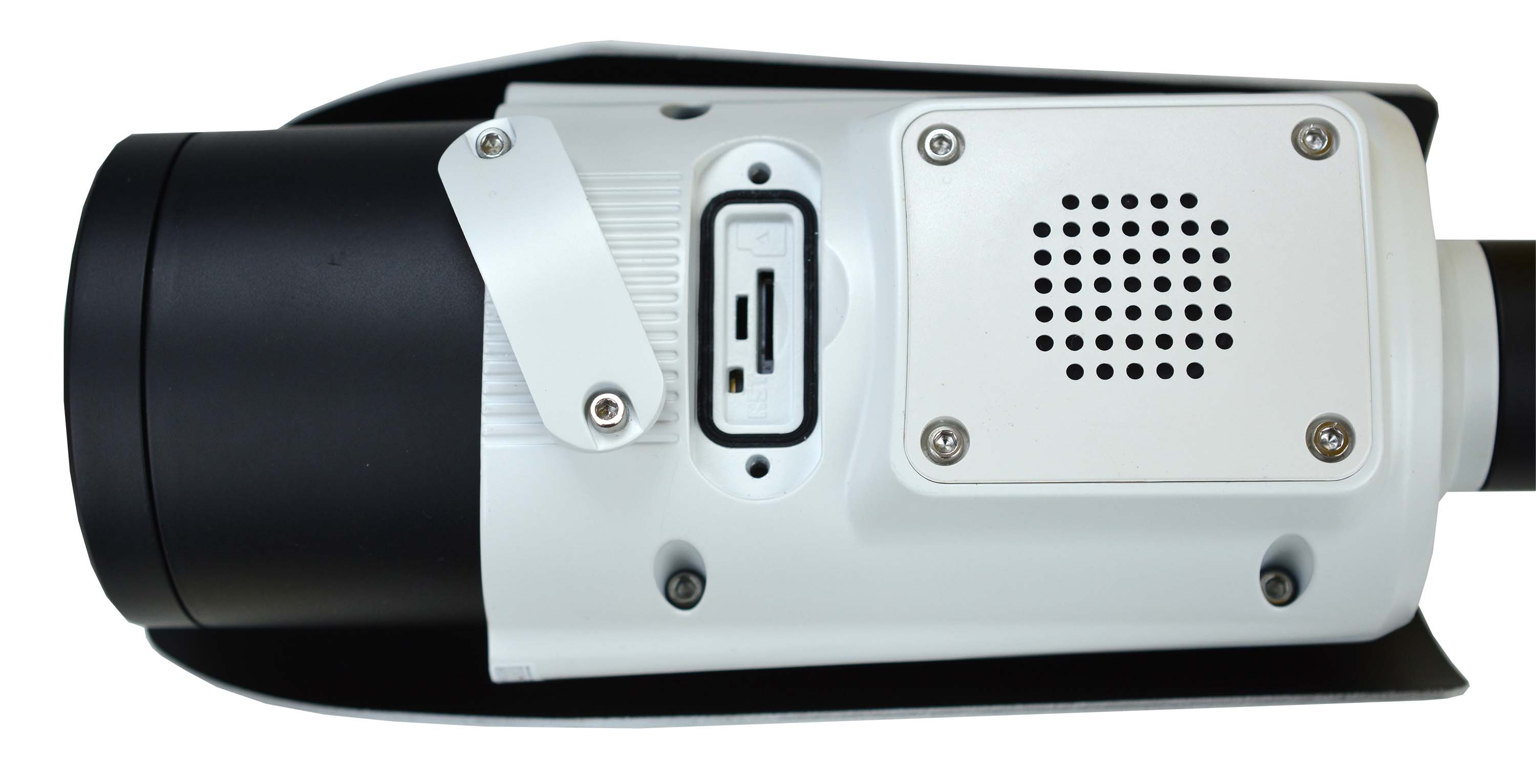 These cameras are equipped with a microSD card slot (C) supporting up to 1TB. Some model also include a 4GB internal memory. The internal memory is used to store authorized plate lists as well as photos and videos of detected plates. The removable memory, on the other hand, can be used to save general-view video recordings, either continuously or only when detections occur. You can access both memory areas from a PC or the app. The microSD slot is protected by a sealed cover, which also shields the reset button (A) and the LED indicator showing proper SD operation (B).