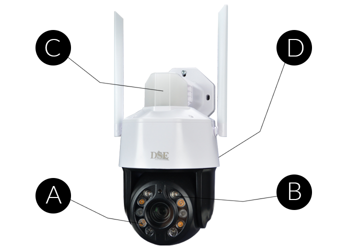 These home automation cameras are active deterrent cameras coming with several built-in alarm devices that are activated when an intruder is detected. The infrared LEDs (A) allow monitoring in the dark while the white LEDs (B) turn on, brightening the scene when an intrusion occurs. Some of these cameras are equipped with a red/blue flashing light (C) which is activated to indicate the alarm status even during the day. The speaker (D) allows you to speak through the app and also acts as a siren in the event of an intrusion.