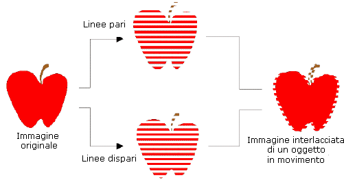 L'interlacciamento consiste nell'inviare, nel nostro caso via cavo, non la totalità delle linee componenti i fotogrammi ma solo il 50%. Successivamente viene inviato l'altro 50%. L'occhio umano non si accorge di questo trucchetto visto che l'immagine permane nel nostro occhio per un certo tempo anche se in realtà è già scomparsa dallo schermo. Ci sembra quindi di vedere immagini piene a ciclo continuo. In realtà, se potessimo discernere i vari passaggi, un oggetto in rapido movimento, le cui linee pari e dispari sono trasmesse in tempi diversi, ci parrebbe come la mela seguente: